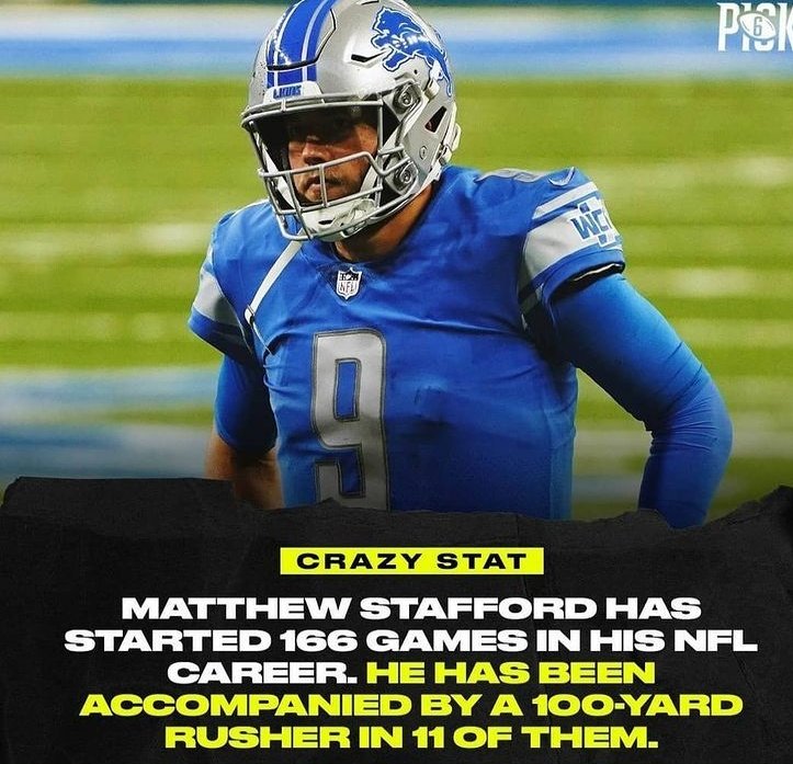 Paul Hembekides On Twitter Matthew Stafford Has Started 166 Games In His Nfl Career He Has Been Accompanied By A 100 Yard Rusher In 11 Of Them